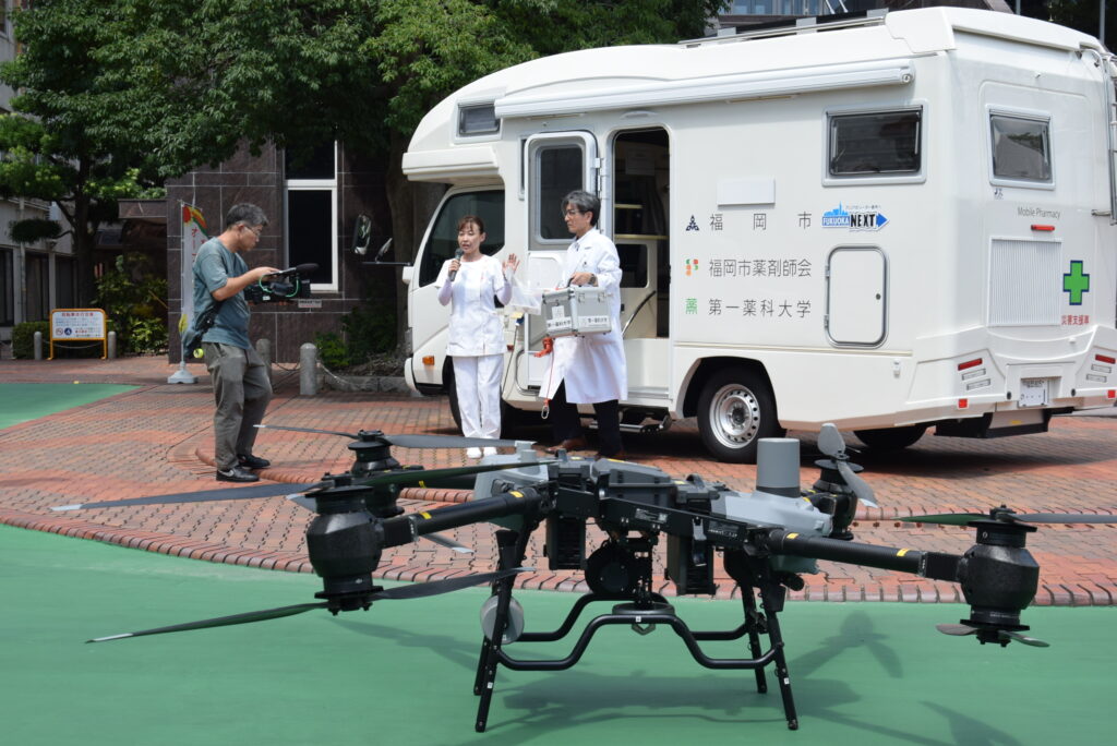 訓練は「移動薬局」とも称されるこの車両と、無人航空機「ドローン」を使って、災害時における医薬品供給の迅速化と効率化を目指した内容でした。