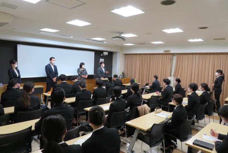 就職活動に向け、入学した1年次から言葉遣いやマナーの基本などを身につけ、面接の練習や就職のための特別講座を用意しています。本校では、就職内定のために在校生本人はもちろん、ご家族・学校が一体となって就職活動に望むことが大切と考え、保護者の方を対象に説明会を行っています。また、企業の総務、人事担当者、さらに支配人が来校し、人材を求め、学校内で説明会が行われます。通常就職説明会は学生が出向いていくもの。いかに本校の学生が期待と信頼を集めているかの証拠です。企業の概念や求めている人材像、採用に関するポイントについて、質疑応答を交えて回答していただけます。