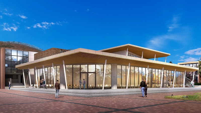 新食堂棟は、飲食時以外にも使える開放感のある居心地良い空間です。約1200席の座席数を予定しています。