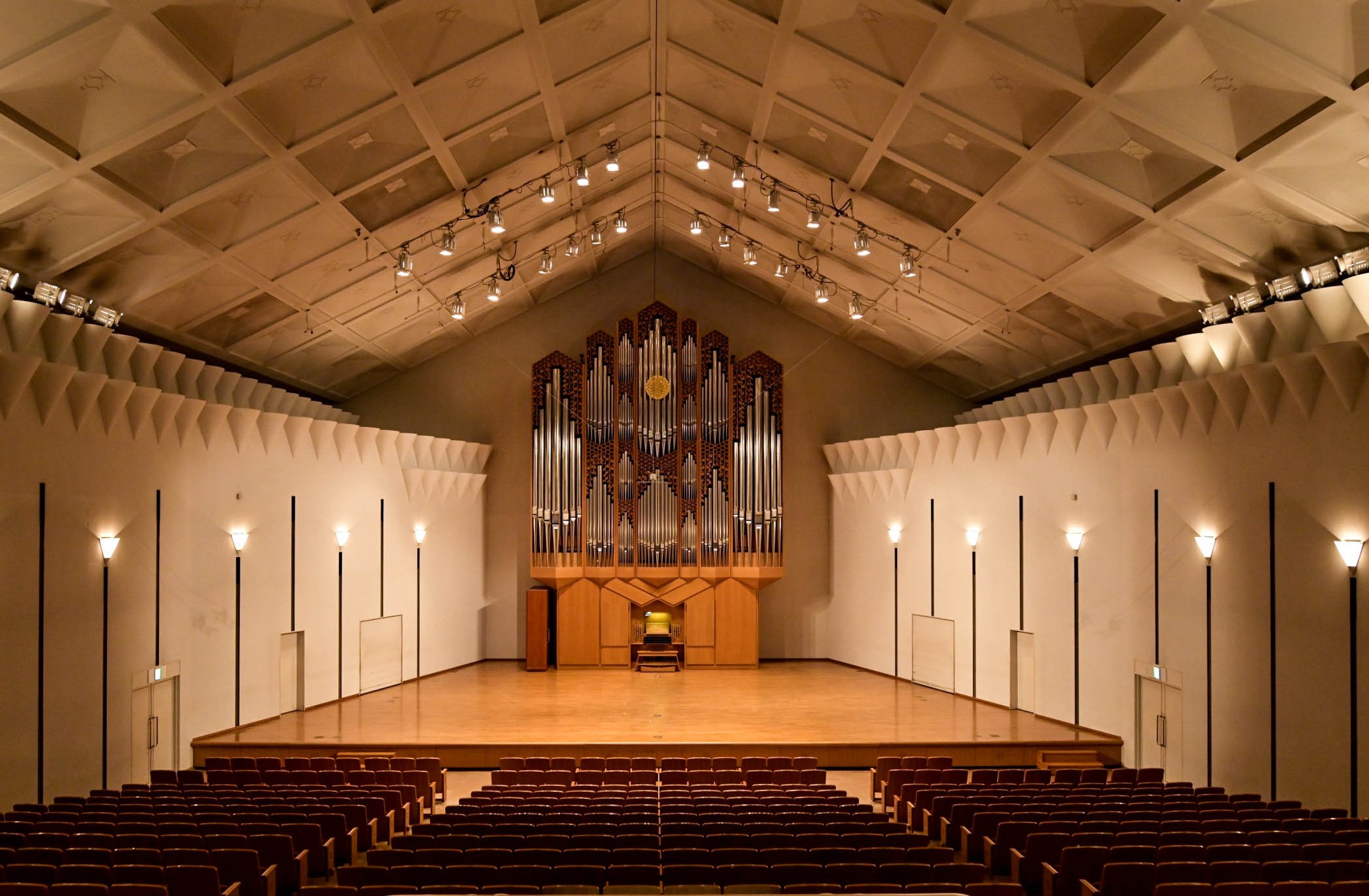 キャンパスは大阪市内とは思えない緑に包まれたロケーション。フルオーケストラが演奏可能なホールには日本の大学屈指のスケールを誇るパイプオルガンを設置しています。
