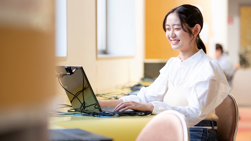 フリースペースに設置しているパソコンは、学生が自由に使用することができます。課題を進めたり、メールをチェックしたり、友だちと話し合いながらグループワークをすることも可能です。