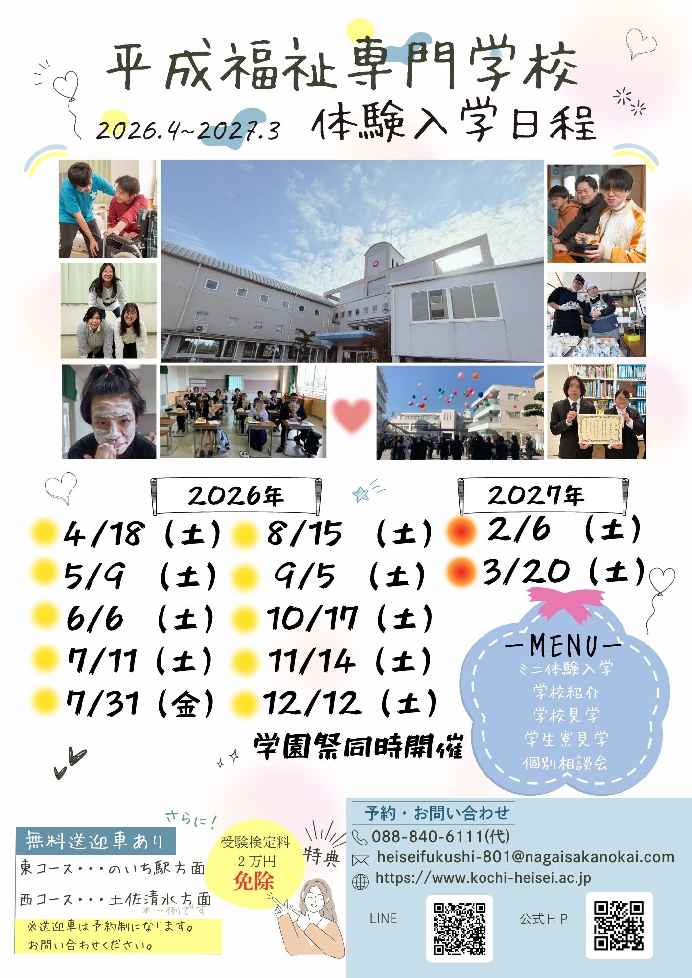 平成福祉専門学校 2026.4〜2027.3 1年間の体験入学の日程になります。
