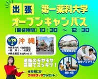 2026.04.21 沖縄で出張オープンキャンパスを開催します。進路に関するモヤモヤを体験でスッキリしませんか?日程:6月20日(土)時間:10時30分〜12時30分場所:沖縄県市町村自治会館 4階 第2・3会議室 沖縄県那覇市旭町116-37内容:大学概要説明 体験プログラム 個別相談申込方法:ホームページhttps://www.daiichi-cps.ac.jp/juken/opencampus/