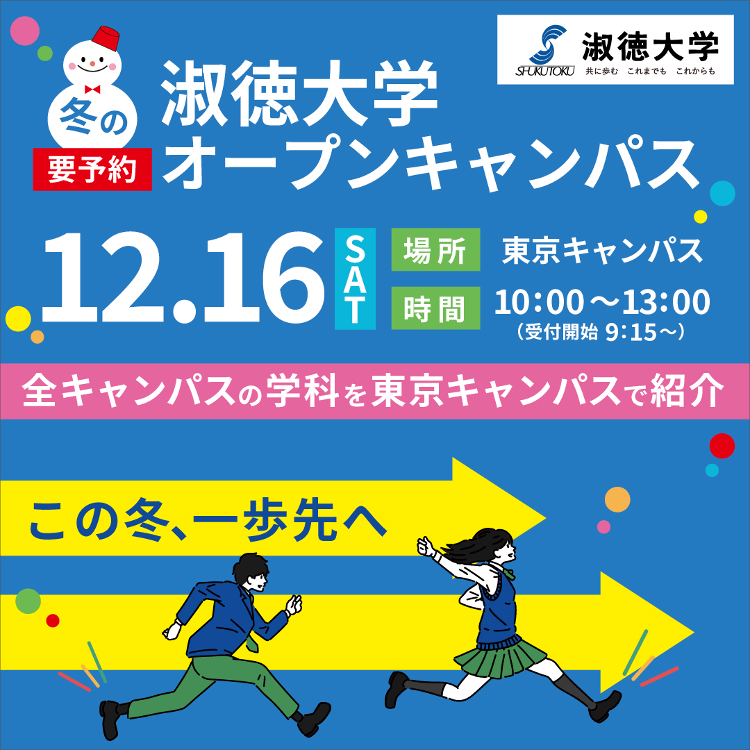 2023.10.27 ■開催日:12月16日(土)■時間 :10:00-13:00(受付開始 9:15-)7学部13学科を東京キャンパスで紹介!【実施内容】・大学全体説明会・キャンパスツアー・在学生相談・個別相談・志望理由対策講座(ベネッセグループ講師による)・2025年度入試について1.2年生も参加しやすいイベントです詳細はこちら▼https://www.shukutoku.ac.jp/admission/oc/tokyo/OC231216.html