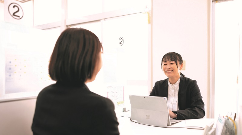 また、学生の個別面談に力を入れており、一人ひとりの課題解決に向け「進路相談」・「履歴書の添削」・「面接練習」などを、一回当たり30分かけて行い、その件数は現在年間延べ約4,000件となっています。