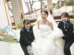 ウェディングに関する知識を学習しながら関連施設での研修を経験した後、実際に本物の結婚式をつくりあげていきます。ホテル や旅行会社、婚礼衣装会社と連携を取りながら、打ち合わせから当日の進行までを手がけることができるフィールドワーク〈World Run〉です。