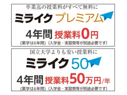 本学は九州圏から優秀な人材を輩出することが、九州はもとより我が国に貢献することと考えています。そのために、力と志(こころざし)のある若者が大学に進学し、有為な人材となることを祈念し、「未来人育成特待生制度」を設置いたしました。是非、本特待生制度を活用して大学で思う存分勉強や実習・実験・研究に励み、多くの友と、一生の師となる先生と出会い、有意義な学生生活を送ってください。そして、社会に大きくはばたいてください。授業料0円となる「ミライクプレミアム」、授業料が50万円/年となる「ミライク50」、その他にも芸術学部独自の「アートミライク」をご用意しています。詳細は本学ホームページよりご確認ください。