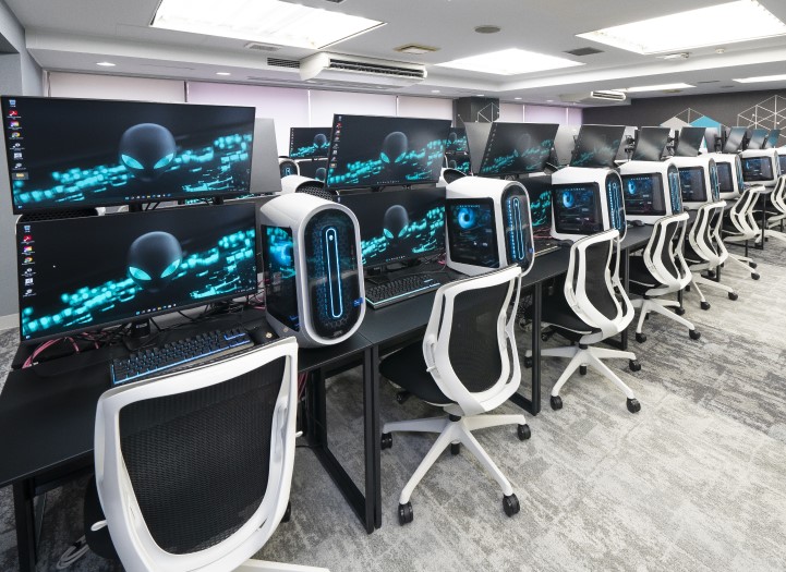情報IT 系コースでは、入学者全員に新型のノートパソコンを貸与します。また、ゲーム・CG・デザイン系コースでは、ゲーム制作やCG制作をおこなうワークステーション、デザイン用のパソコン、VR機やゲーム機、スマートフォンなどさまざまなデバイスを用意しているので、多岐にわたりチャレンジできる環境が整っています。