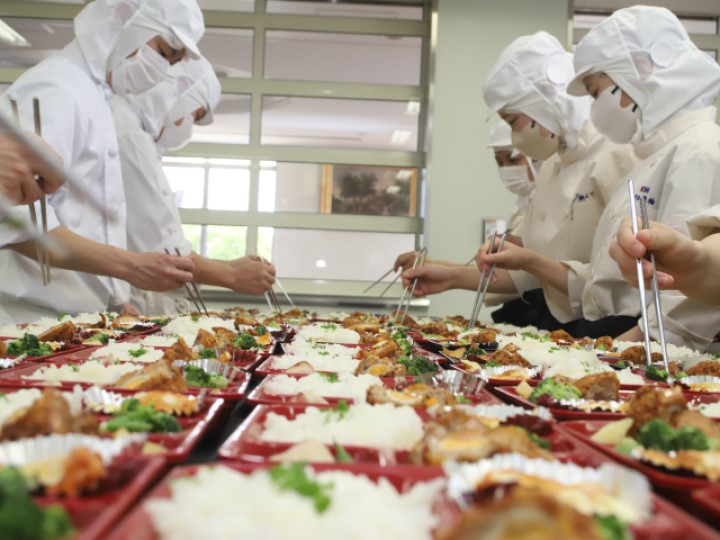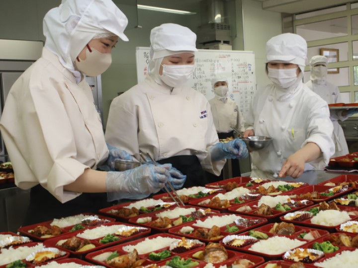 給食実習室では、衛生管理を意識した実践的な調理を学び、
