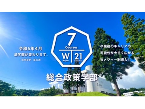 2024年4月から、法学部が総合政策学部に名称を変更しました。同時に、学生の興味・関心に合わせて学べる環境を整えました。入学時は学部一括募集とし、学科・コースの選択は2年次から。そして2学科・7コースから2つのコースを選択できるWメジャー制も導入。1年次はじっくり進むべき方向性を探り、2年次からは2つの専門性を身に付けることができるカリキュラムとなっています。