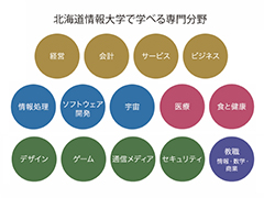 大学の名前から、理系の大学というイメージを抱く人が多いようですが、実はそうでもありません。eビジネスや医療事務を学ぶ学科がありますし、デザイン、デジタルサウンド、ゲーム制作等について学べる学科もあります。これらの学びのなかにも「情報」は深くかかわっています。「情報」を理解し活用する力を得ることで活躍できる分野は大きく広がります。