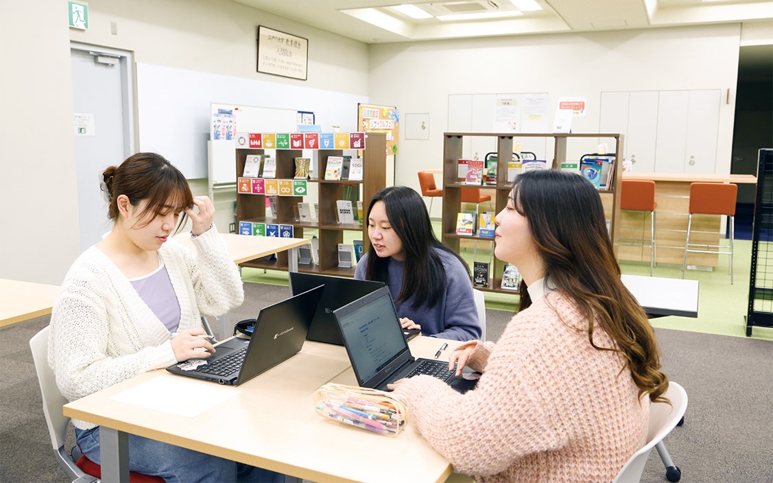 学生一人に一台ずつ、最新ノートパソコンを無償貸与し、独自のカリキュラムで情報教育を展開しています。構内はWi-fi 完備でどこでもインターネット。学生全員に付与するユーザーアカウント「EDO-NET ID」で、メール・ストレージ・オンライン授業等のGoogleサービスなどが利用可能です。自分だけのノートパソコンで、ITリテラシーはもちろん、データを使って調査し、まとめ、伝える、大学での学びを支える活用スキル(アカデミック・スキル)をしっかり身につけられます。