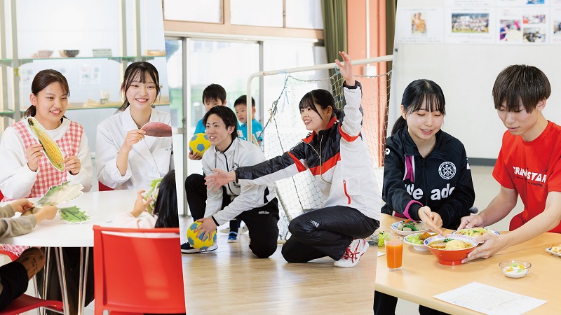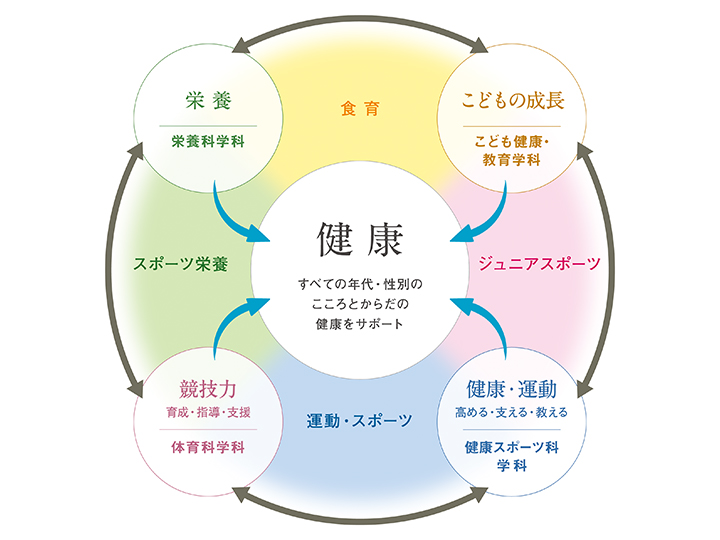 学びのコラボレーション 本学では多様な能力を身につけるための「学びのコラボレーション」として、所属する学科以外の指定科目を受講し、単位を修得できる「学科間相互の科目履修」制度があります。さらに「食育」「スポーツ栄養」「ジュニアスポーツ」などをキーワードに、各学科間の枠を超えた学びの相乗効果を実現しています。