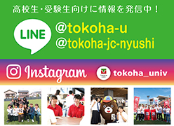 LINE、Instagramで最新情報をお届けします! LINE、Instagramで様々な情報をお届けしています●LINE@tokoha-jc-nyushiLINEの「友だち追加」から「ID検索」で登録してね!●Instagramtokoha_univ「常葉大学」で検索!