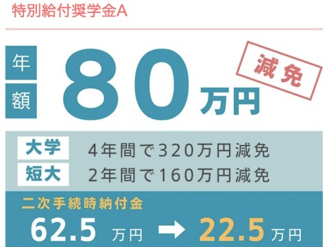 特別給付奨学金(A) 年間80万円学費減免