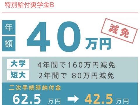 特別給付奨学金(B) 年間40万円学費減免
