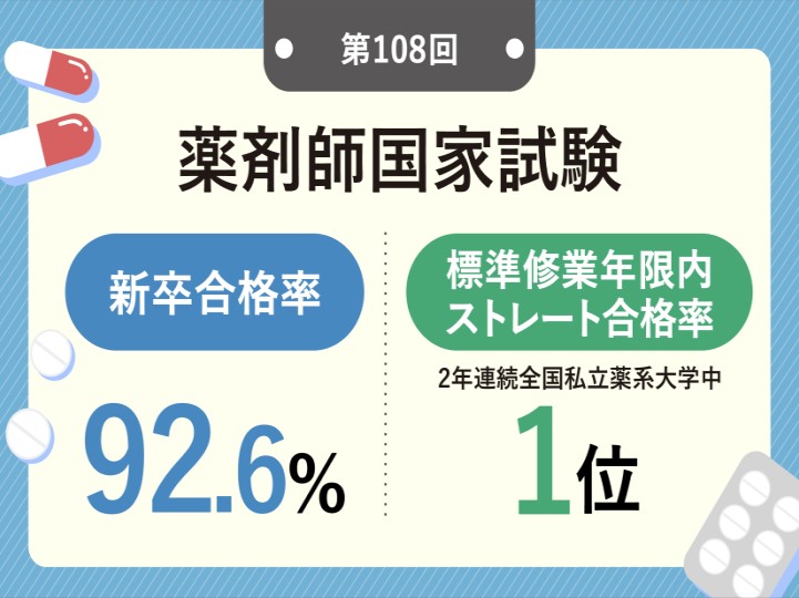 現在文部科学省から公開されている、入学した学生に対する6年間で卒業し最初の国家試験で合格する学生の割合(ストレート国家試験合格率)で、本学は第107回と第108回薬剤師国家試験において2年連続全国私立薬系大学中第1位の成績を上げています。