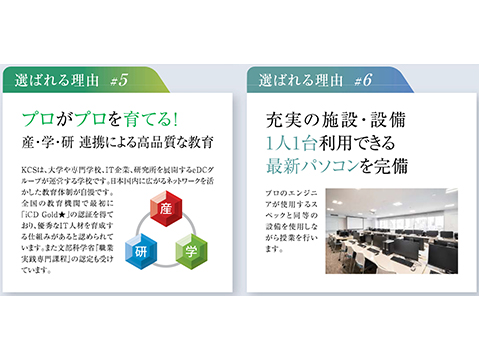 KCSは、大学や専門学校、IT 企業、研究所を股開するeDC グループが速党する学校です。日本国内に広がるネットワークを活かした教育体制が自慢です。全国の教育機関で最初に「iCD Gold」の認証を得ており、優秀なIT 人材を育成する仕組みがあると認められています。また文部科学省「職業実践専門課程」の認定も受けています。