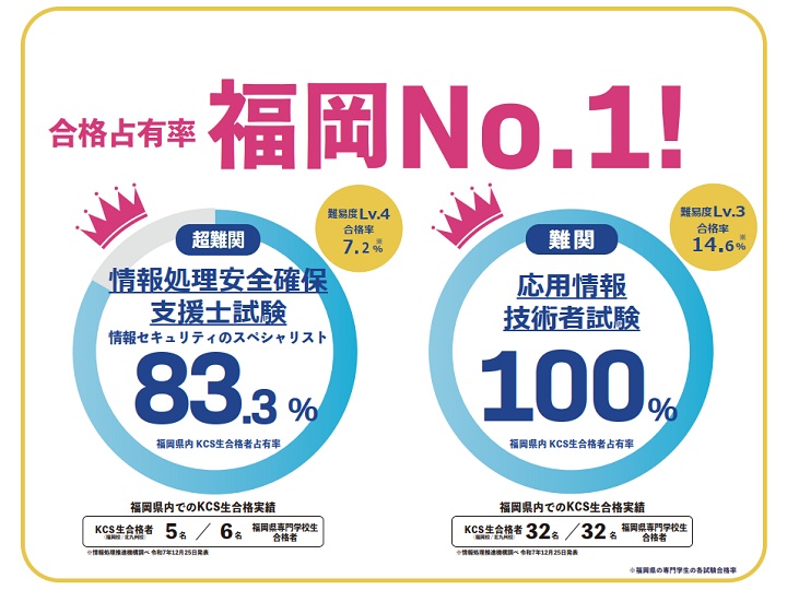 IT国家資格の在校生合格者数は福岡県No.1、学園全体では日本1位の実績です。