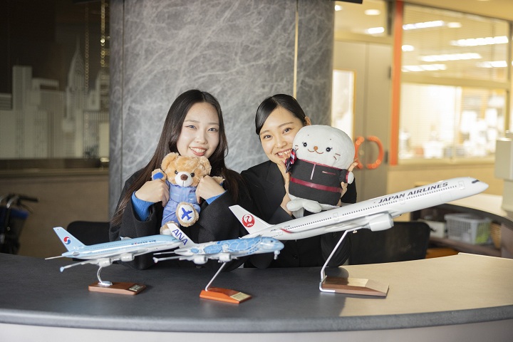 エアライン学科の学生には、実際に使われていた飛行機の座席や荷棚を用いたモックアップや、空港カウンターをイメージした設備。ブライダル・ホテル学科の学生には、式場やホテル、ドレスショップなど幅広いシーンを体験学習できる設備。公務員学科の学生には、体育館やトレーニングジムをそれぞれ設置しています。専用設備で、学内でもしっかりと実践的な学びを積むことができます(各設備は、学科関係なく使うことができます)。