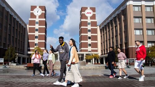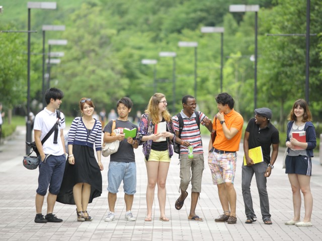 世界中から学生が集まる国際的なキャンパスを学生スタッフが案内するツアーや