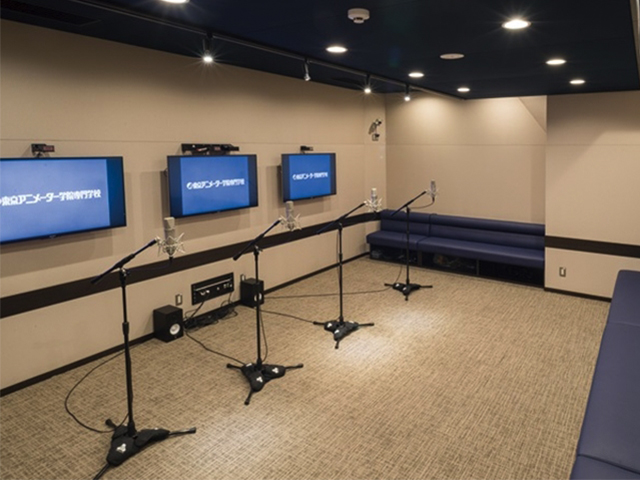 アニメのアテレコや外画の吹き替え、ヴォーカル収録まで可能な収録スタジオ。プロ仕様の最新機器を使ってクオリティの高い実践的な授業を受けることができます。