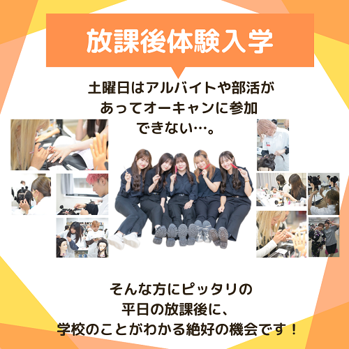 2025.02.25 ◆◆◆放課後体験入学◆◆◆土曜日はアルバイトや部活があってオーキャンに参加できない…。そんな方にピッタリの平日の放課後に、学校のことがわかる絶好の機会です。体験実習だけでなく個別相談もできますので、ぜひお越しください!開催日:ホームページにて開催日公開中時 間:いずれも15:30〜16:30(要予約)ご予約はお問い合わせください。abinfo@icb.ac.jp045-290-7090