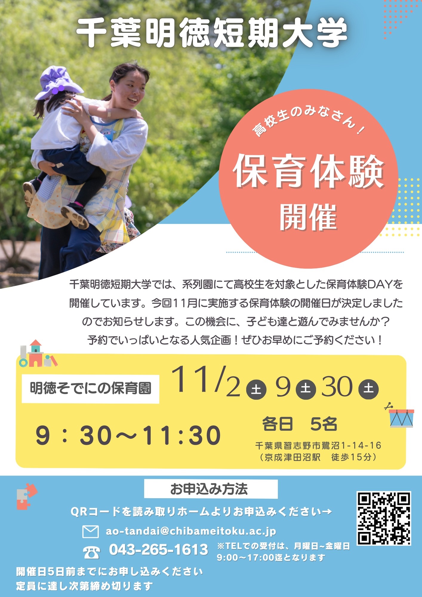 2024.10.09 保育の体験をしてみませんか?11月は系列園である明徳そでにの保育園で保育体験を開催しています【日程】11/2(土)、9(土)、30(土)【時間】9:30〜11:30☆お申し込みはHPの保育体験よりお申し込みいただけます。お申し込みいただいた方には改めてご案内のお知らせを郵送いたします