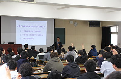 2025.06.19 4月25日、みずほ証券(株)の 浜崎祐一郎 氏(グローバル戦略部 金融経済教育推進室 上級研究員)を講師に迎え、経済学部・総合政策学部の新入生を対象に、「自分とお金との付き合い方」と題した特別授業を実施しました。https://www.nau.ac.jp/news/283977.html