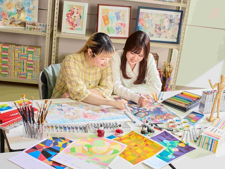 各業界の現役プロが講師として直接指導!初心者から無理なく学べるカリキュラムで、基礎デッサン力や画材技法、デジタルスキル、デザインスキル、発想力など幅広い知識・技術を学び、表現の幅を広げます。また、絵を描く技術だけでなく、「絵を描く」コトを仕事につなげるために必要な知識やビジネスマナー等も学べます。