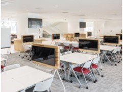 2022年4月から利用開始している情報棟には、グループワークの充実を図る「ラーニングコモンズ」が設けられているほか、コンピュータ教室、総合的な情報システム実験を行うIoT実験室等を整えており、情報系教育・研究体制を強化しました。