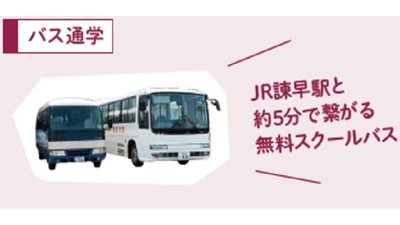 • JR「諫早駅」西口より無料スクールバスで約5分。JR「諫早駅」長崎県営バス諫早ターミナルより「破篭井」(わりごい)行き乗車、「西栄田」バス停下車、約10分。