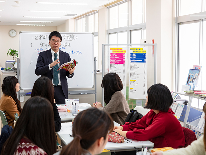 学生一人ひとりが希望の進路を実現できるよう、低学年次からの全体ガイダンスをはじめ、内定者による就職活動報告会、各種講座の開催など、さまざまな形で就職活動をバックアップしています。地元密着型の大学として、岡山県内出身者の約90%が地元に就職。県外出身のUターン就職を希望する学生のために、各出身地においても企業や関係団体を訪問し、求人開拓や情報収集を行っています。