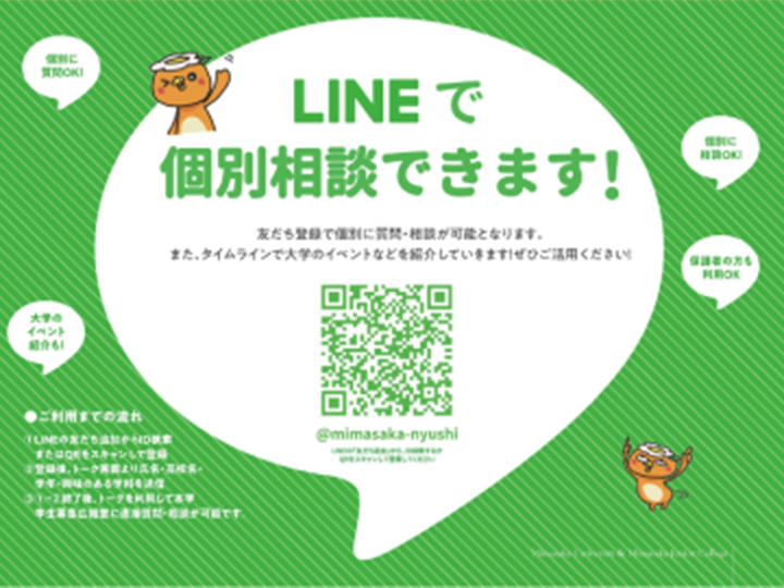 LINEの公式アカウントを開設しています。友だち追加を行いトークをご利用いただくことで質問等が可能になります。入試のことから大学生活のことまで何でも気軽に質問してください。また、タイムラインやメッセージを用いてオープンキャンパス情報や入試情報を配信していますので質問がない方でも追加をオススメします。