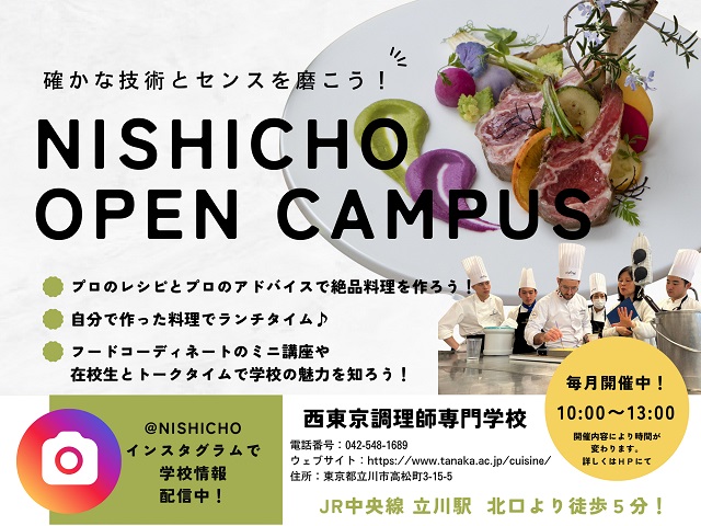 西調のオープンキャンパスは在校生と一緒の調理実習や施設見学、個別相談など盛りだくさんの内容。自分で作った料理を試食!友達やご家族との参加もOK わからない事は何でも聞いてね!料理に興味がある人、調理が好きな人、一度オープンキャンパスに参加してみよう!
